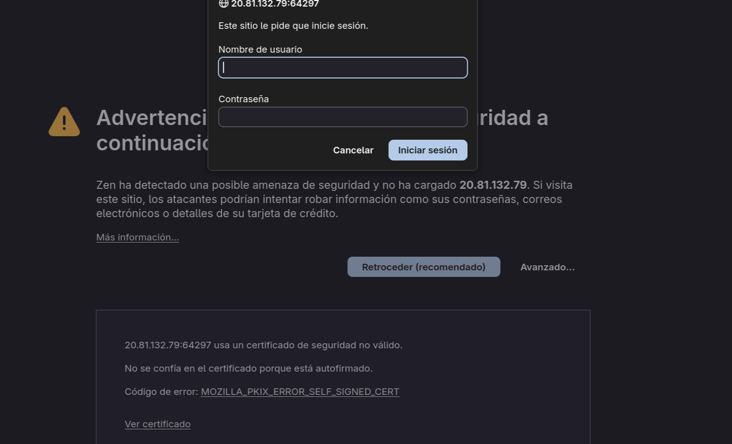 Al tratarse de un certificado SSL autofirmado generado durante la instalación (no emitido por una Autoridad Certificadora reconocida), el navegador mostrará una advertencia de seguridad indicando que “la conexión no es privada” o “el sitio no es seguro”. Esta advertencia es esperada y técnicamente correcta: el certificado no puede ser verificado contra una cadena de confianza pública. Sin embargo, dado que controlamos tanto el servidor como el certificado, podemos proceder de manera segura añadiendo una excepción en el navegador.