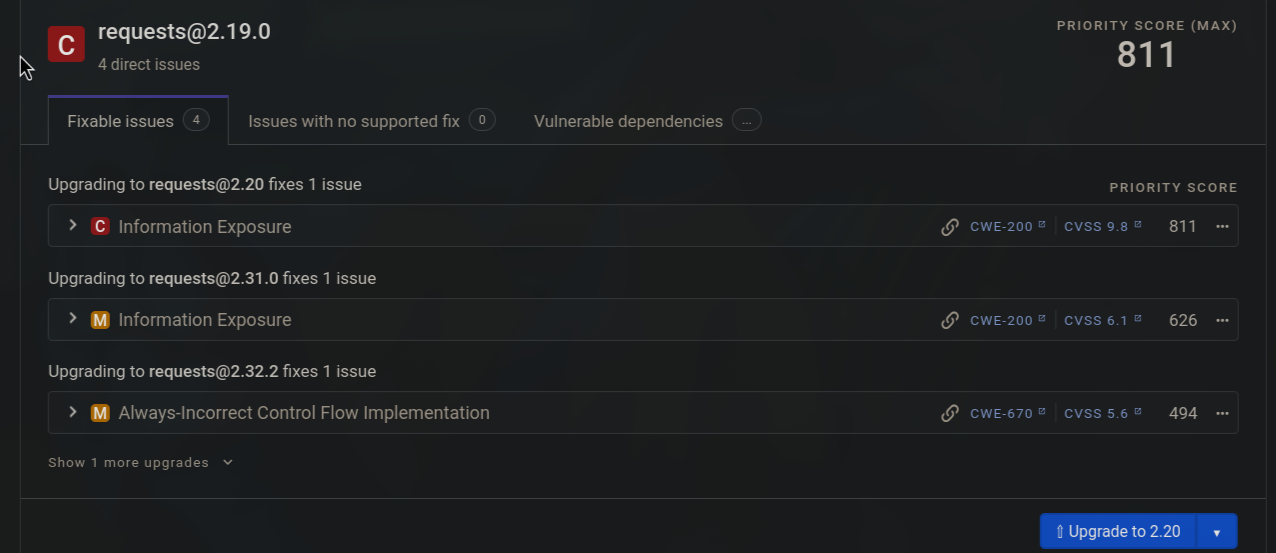 - Requests 2.19.0: Esta versión tiene vulnerabilidades conocidas de exposición de información. Snyk sugiere actualizar inmediatamente a la versión 2.20 o superior.
