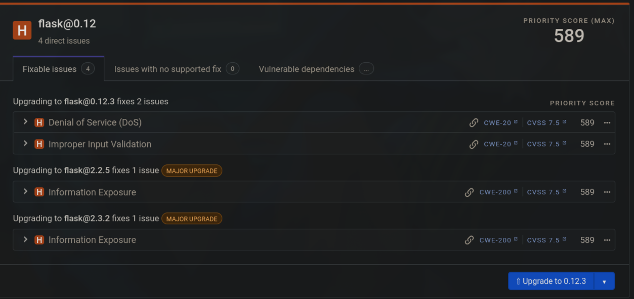 - Flask 0.12: Una versión muy antigua con riesgo de Denegación de Servicio (DoS) y validación de entrada impropia. La recomendación es un salto mayor a la versión 1.x o 2.x.