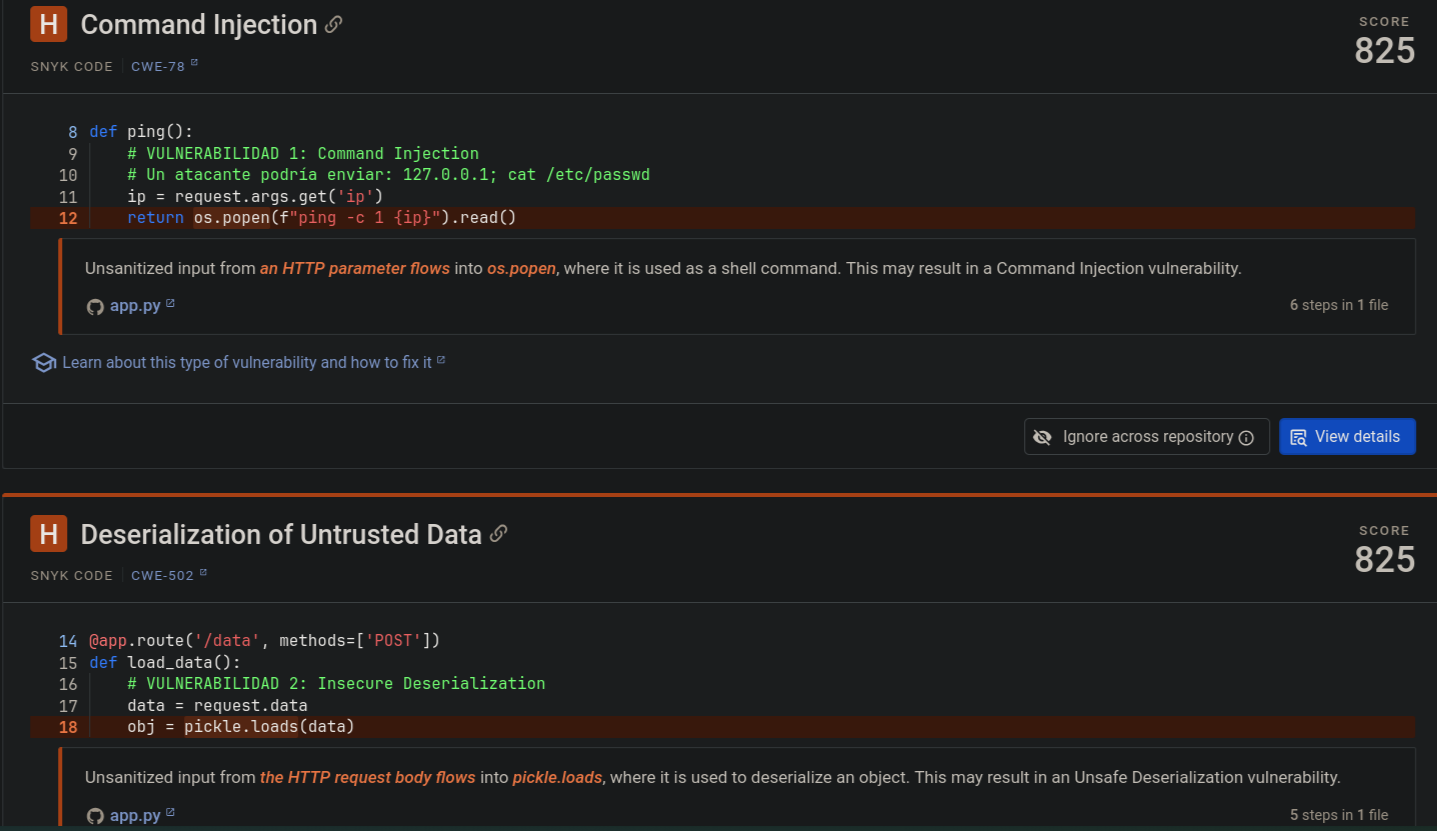 app.py, el códigoos.popen(f"ping -c 1 {ip}").read()permite que un atacante concatene comandos del sistema operativo si no se sanea la entradaip. - Deserialization of Untrusted Data (Severidad Alta - Score 825): En la línea 19, el uso de